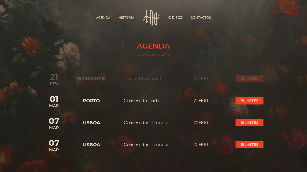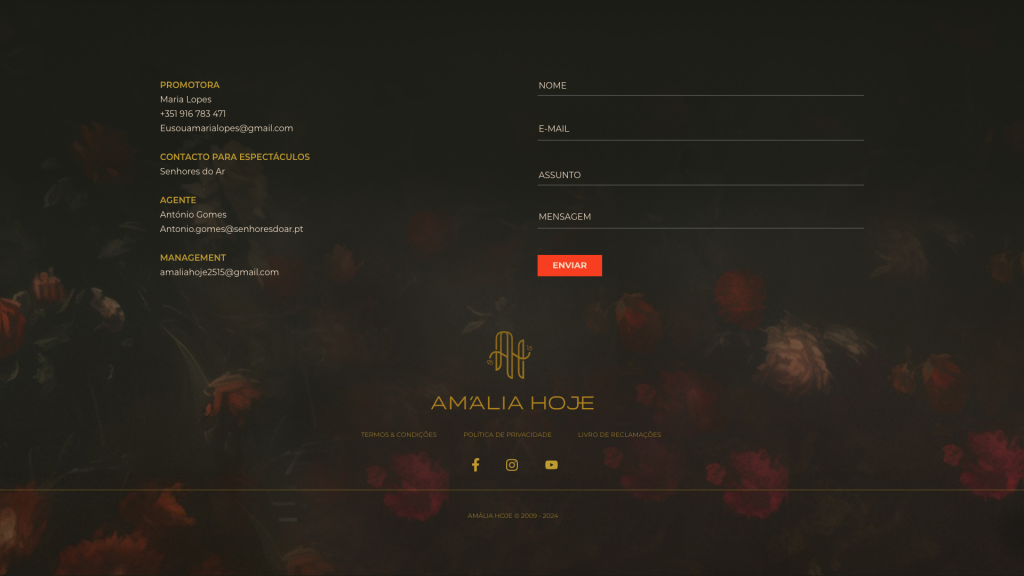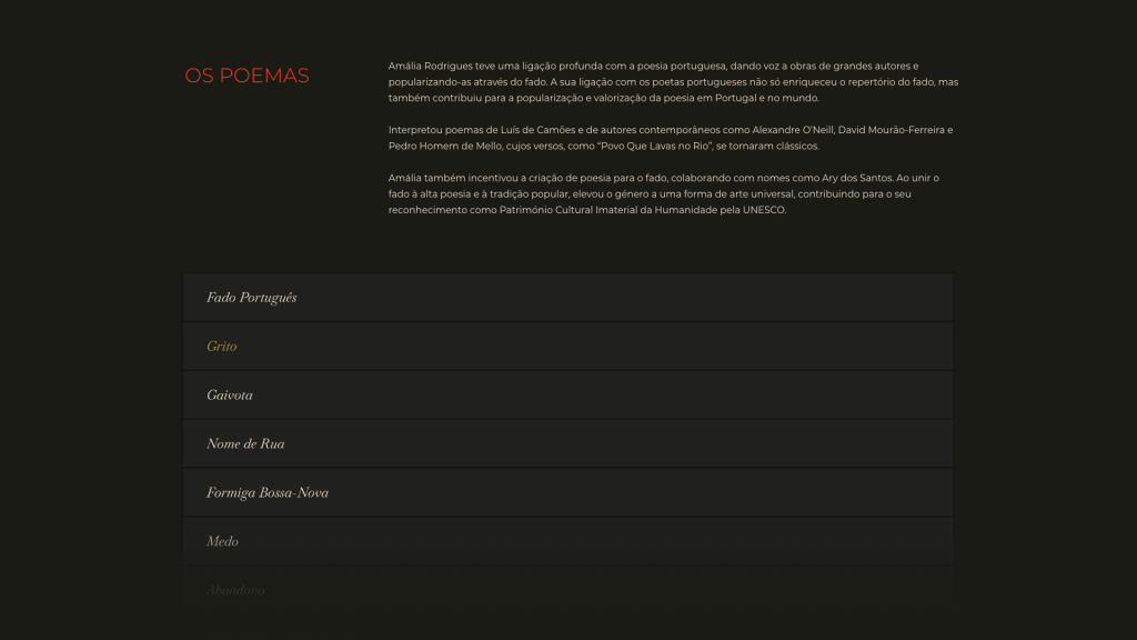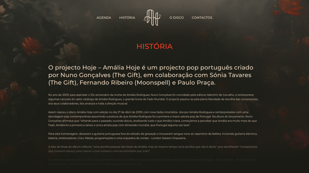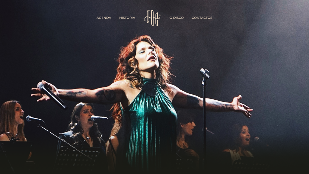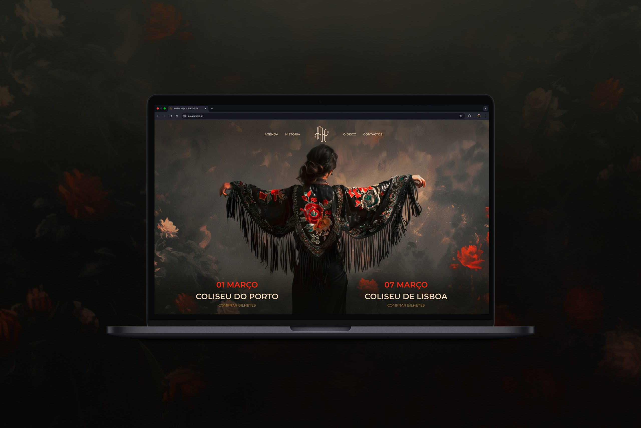 O conceito do site nasceu a partir da identidade visual do single Fado Amália — uma fusão entre a tradição do Fado e a modernidade da Pop. As cores sóbrias, como o preto e o dourado, remetem à elegância do fado clássico, enquanto a tipografia contemporânea traz uma sensação de frescor e modernidade.